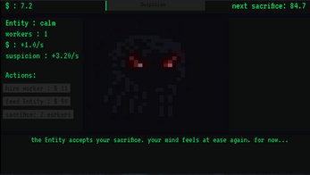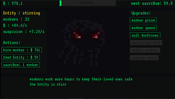 This is an incremental, economy sim where you must appease a cosmic entity to keep it from awaking. You work tirelessly; feeding, sacrificing your own workers -your mind slipping more and more, as the world around you grow suspicious of all these missing people and a growing sense of dread. How long can you keep us safe?